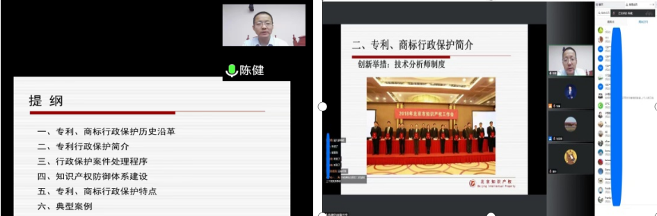 陈健副处长从专利、商标行政保护的历史沿革入手,结合北京市知识产权行政保护工作的先进经验和典型案例,对专利、商标的行政保护进行了全面系统的介绍,使参训学员对专利、商标行政保护案件的处理程序有了更为全面的了解,加深了学员对网络、展会、电商、专业市场等重点领域知识产权保护工作的认识和把握。培训期间,学员就知识产权行政执法过程中所遇的实际问题纷纷“举手”提问,陈健结合自身工作经验进行了细致耐心的答疑解惑,经验分享环节受到了学员的普遍欢迎。课程结束后,培训班组织了线上结业测试,240名参训学员报名参加测试,其中171人成绩合格并获颁结业证书。