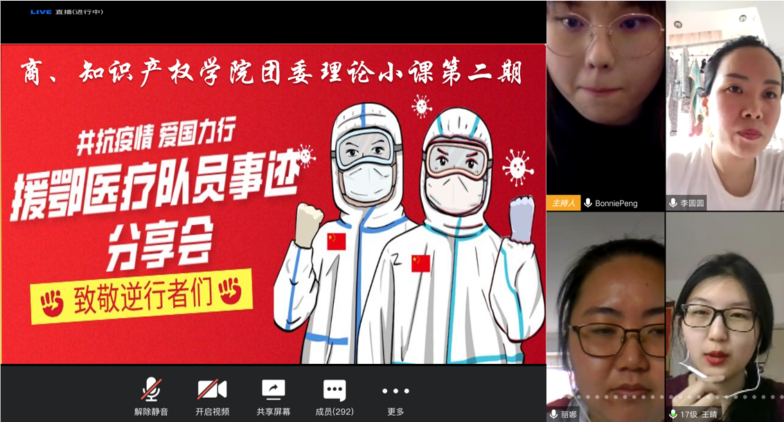 在举国抗“疫”的特殊时刻,4月25日下午14:00,大连理工大学商学院、知识产权学院师生通过“腾讯会议”平台与盘锦市援鄂医疗队队员举行“共抗疫情,爱国力行”主题线上座谈。盘锦市中心医院援鄂医疗队员赵丽娜、李圆圆作为特邀嘉宾分享武汉一线战“疫”经历,商学院、知识产权学院全体学生党员、发展对象、入党积极分子、团学骨干及部分教师党员共340余人参加线上座谈会。
