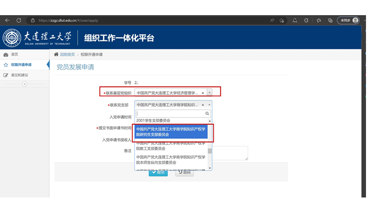 (2)在联系基层党组织中选择“中国共产党大连理工大学经济管理学院委员会”,联系党支部中选择本人所属党支部(本科生选择“中国共产党大连理工大学商学院知识产权学院本师生纵向支部委员会”;研究生选择“中国共产党大连理工大学商学院知识产权学院研究生支部委员会”;教工选择“中国共产党大连理工大学商学院知识产权学院教工支部委员会”)