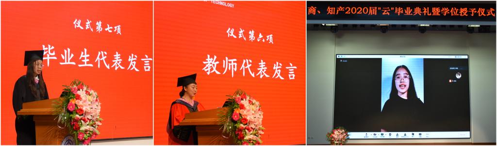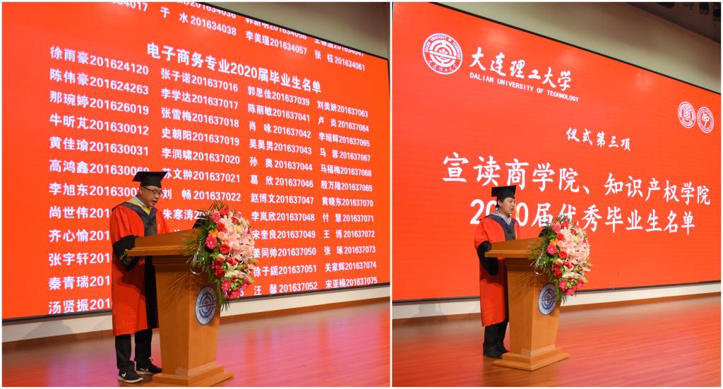 典礼上,学院副院长李彤宣读了《关于准予商学院、知识产权学院姚丽艳、张云霄等13名研究生毕业并授予学位的决定和齐心愉、彭博等310名本科生毕业并授予学位的决定》;学院副院长洪勇宣读了《商学院、知识产权学院2020届优秀毕业生名单》。