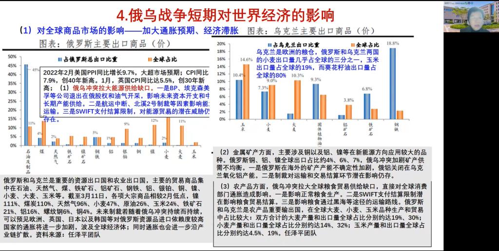 成力为教授从俄乌战争的进展讲起,简要梳理俄乌战争的时间线,并由此引出“西方对俄罗斯的制裁”这一话题。成教授重点分析了本轮金融制裁的三个重点和两个特征,逐一分析解读美国、英国、欧盟、日本等国家或组织公布出的制裁措施,以及“埃森哲等国际公司退出俄罗斯市场”背后的经济意义。接着,就“美国的制裁从俄罗斯联邦储蓄银行开始”这一现象,联系教学实例,为同学们生动解读其背后的经济意义,同时深刻分析了西方国家“将选定的俄罗斯公司从SWIFT剔除”这一制裁方式将会对俄罗斯、对欧洲乃至对全球系统性金融安全产生的影响。最后,成教授概括介绍了俄罗斯的反击制裁,分别分析了俄乌战争短期对世界经济、对中国经济的影响,引导同学们一起思考西方制裁俄罗斯将给中国经济、产业安全带来的的启示。