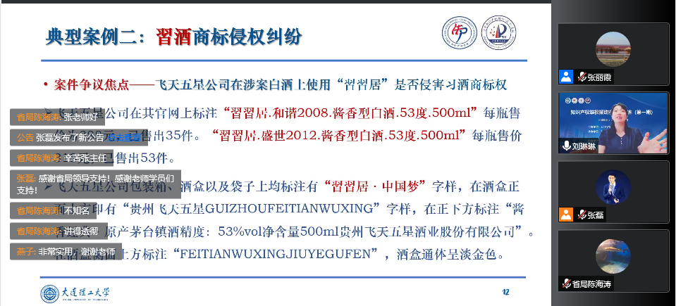 7月15日-27日,由辽宁省知识产权局主办、国家知识产权培训(辽宁)基地和大连理工大学知识产权学院联合承办、大连至诚专利代理事务所协办的“知识产权维权援助宣传系列培训班(线上)”成功举办。大连理工大学商学院、知识产权学院院长助理刘琳琳副教授、大连至诚专利代理事务所创始合伙人涂文诗律师、广州三环专利商标代理有限公司颜希文副总经理分别以“商标侵权判断标准典型案例述评”“发明及实用新型专利侵权判定与维权”和“外观设计专利检索与侵权判定”为题分享了他们在各自领域知识产权维权与保护的宝贵经验和生动案例。国家知识产权局挂职干部、国家知识产权培训(辽宁)基地副主任兼大连理工大学知识产权学院院长助理张磊主持培训,辽宁省知识产权局保护处陈海涛、国家知识产权培训(辽宁)基地张丽霞及来自省内外各市县(区)负责知识产权行政执法、行政裁决及维权援助工作人员,各知识产权保护中心、维权援助中心及工作站相关工作人员,各地维权援助服务相关企事业单位人员,各地专利代理机构相关人员累计878人次参加培训。