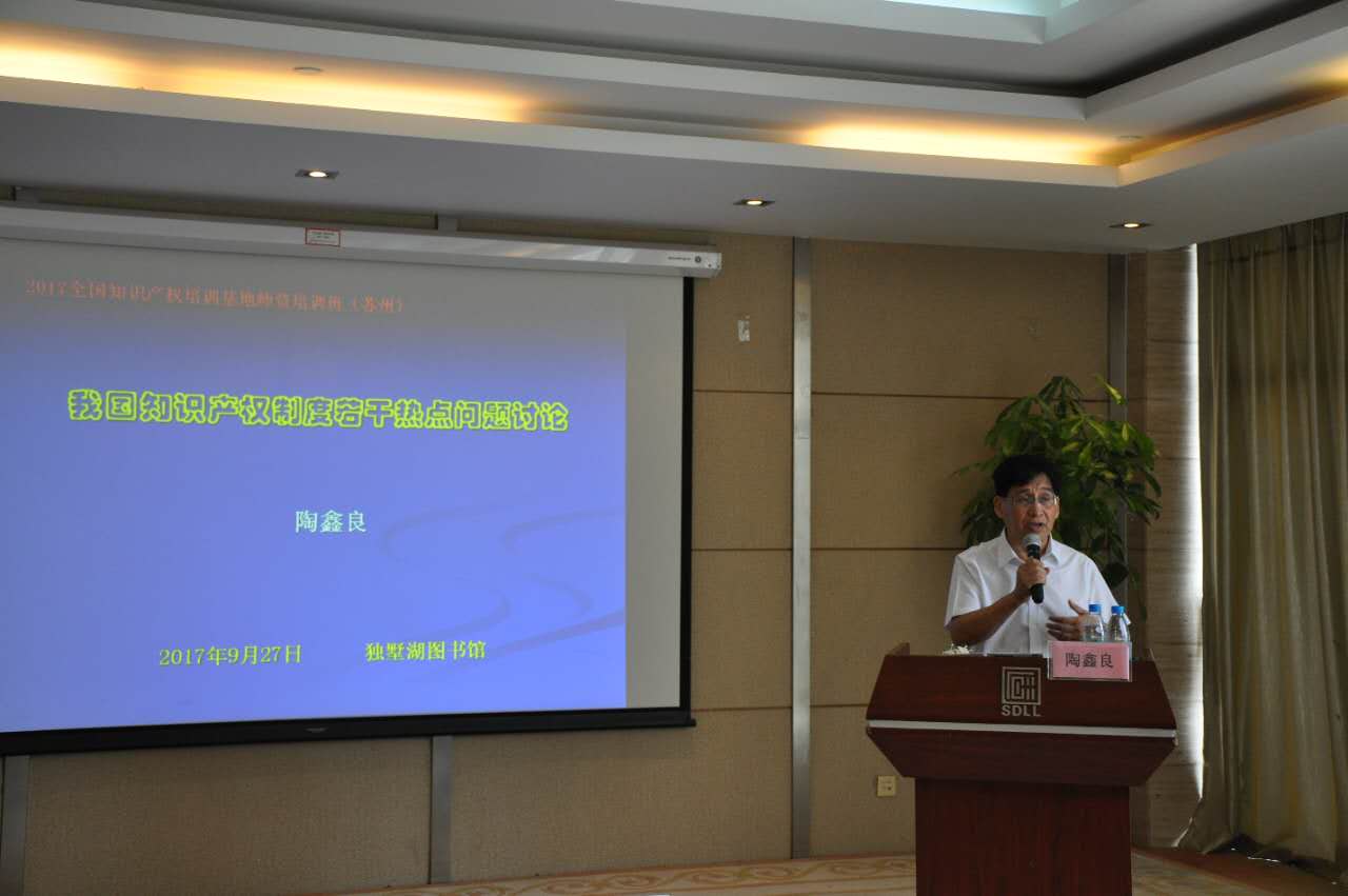 9月26日-29日,2017年全国知识产权培训基地师资培训班在苏州独墅湖图书馆举办,中国知识产权培训中心副主任孙玮在开班式致辞,来自全国知识产权培训基地50余位师资参加培训,陶鑫良院长受邀做了题为我国知识产权制度若干热点问题讨论的专题讲座。