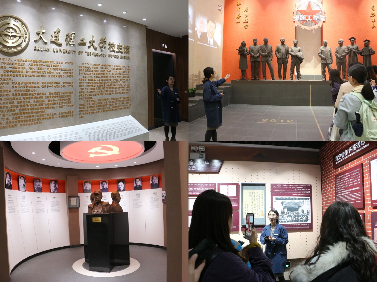 追溯往昔、夯实于基、逡巡求索。上午11时,45名校区同学到达主校区校史馆,并在校史馆讲解员刘老师的带领下有序地开展参观学习。校史馆在设计上以大工红色基因为核心,一楼展馆主要展现大工建校起步时期的成长历程。推开大门,映入眼帘的便是我校在大连工学院时期的校牌,斑驳的印记裹藏着一段段温润的情愫,它宛若一位古稀之年的探路人,笑迎着每一位前来参观的大工后辈,细数家珍般地述说着过往点滴。措辞精炼的《大工赋》寄托着一代代开拓者的祝福与祈愿;坚实厚重的围墙流露着老一辈师生携手共进的信念;亲手誊写的文卷教材蕴藏着老教师们躬身育人的坚守。步入正厅,学校奠基人的群雕熠熠生辉,展现了“海纳百川、自强不息、厚德笃学、知行合一”的大工精神。