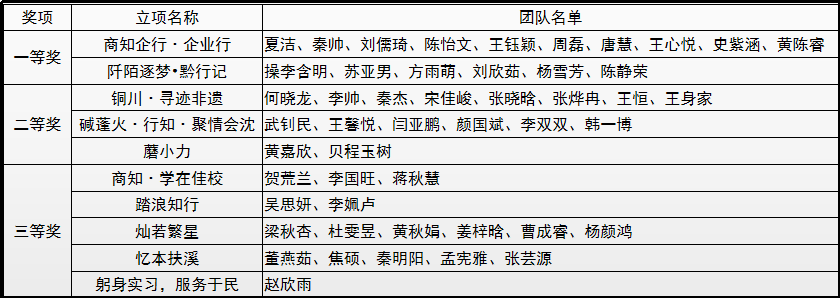 根据《关于举办商学院、知识产权学院社会实践立项策划书大赛的通知》,经自主申报、材料审核、现场答辩、评委投票,现将获得商学院、知识产权学院社会实践立项策划书大赛结果公示如下:
