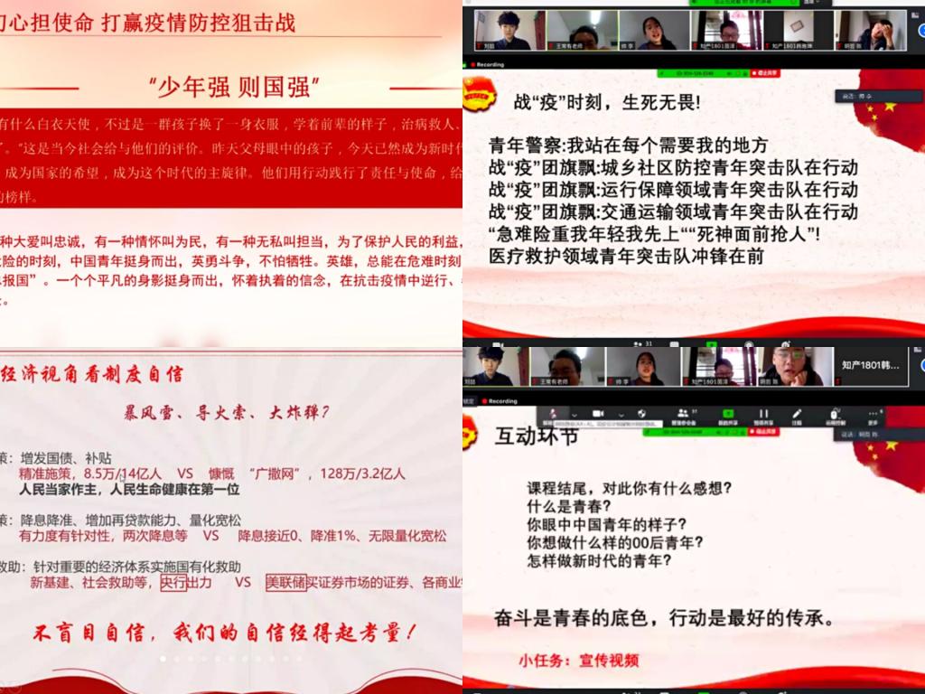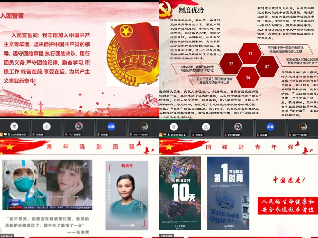 聚焦疫情防控,展望青年未来。电商1702团支部采取线上演讲方式,深入了解疫情防控中的感人事迹,引导青年学生学习践行五四精神,传递青春力量;电商1801团支部采取线上朗诵方式开展团日活动,邀请班级志愿者分享所见所闻并录制以抗疫为主题的朗诵视频,从抗疫角度探讨青年人的责任与担当,以此引导同学们坚定“四个自信”,绽放青春力量;电商1902团支部和经济1901团支部观看了青春战疫系列纪录片,分享抗疫中奋斗的青春美丽身影及其背后的抗疫青春故事。