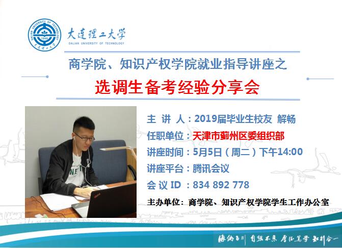 为了进一步引导学院2017级、2018级学生科学合理制定未来发展规划,5月5日下午14:00,商学院、知识产权学院学生工作办公室特邀目前任职于天津蓟州区委组织部的2015级暨2019届毕业生校友解畅为大家带来选调生备考经验分享会,商学院、知识产权学院40余名2016级、2017级、2018级学生参加本次分享会。