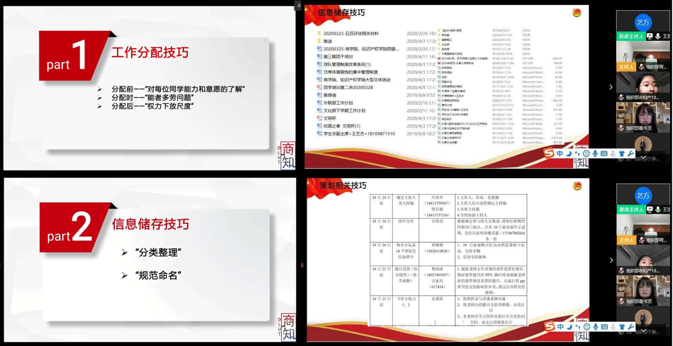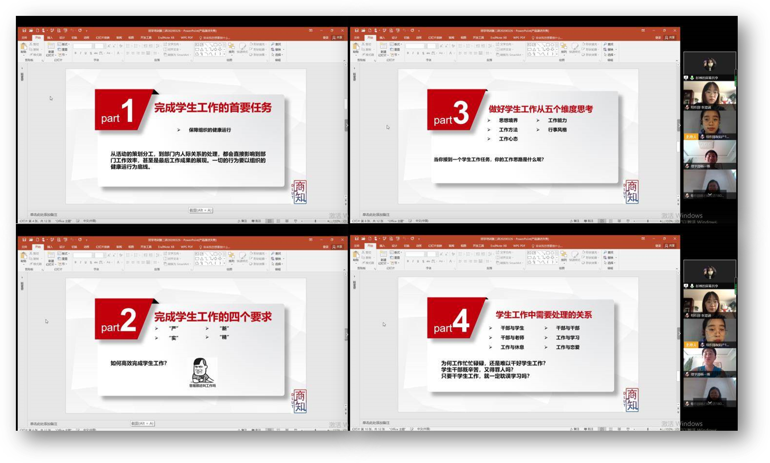 为进一步提升学院学生干部思想政治素质,教育引导学生干部在疫情防控特殊时期发挥模范带头作用,提高个人工作能力和工作效率,商学院、知识产权学院团委于近期开展三期线上团干培训,此次团干培训主要面向学院团委学生会全体成员及各班班长、团支书,共240余人参加培训。