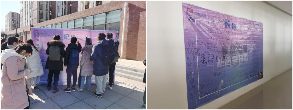 祝福留言同暖心。“一举夺魁宏名扬,霞光裹身云满天”。学院团委于11月23日中午在B12美食广场举办了考研祝福墙留言活动。正午时分,阳光正好,很多老师和同学停下脚步,为考研学子留下自己美好的祝愿,祝福墙上很快就写满了“五彩斑斓”的祝福语。当天,满载着祝福的留言墙就出现在学院考研自习室的外墙上,让辛勤备战考研的同学获得奋进的力量。