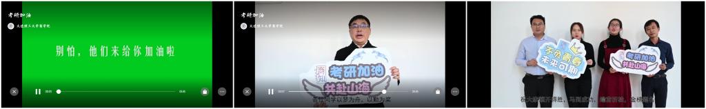 宣传视频来助力。“吹灭读书灯,一身都是月”。进入最后冲刺阶段,考研学子可能面对前所未有的压力。学院团委邀请学院领导、专业教师、辅导员、班主任并招募部分学生代表制作考研加油视频,为考研学子树立信心,加油打气。无论是来自学院领导、老师的殷切期望,还是来自学弟学妹的真心祝福,相信都将给予考研学子莫大的鼓励。