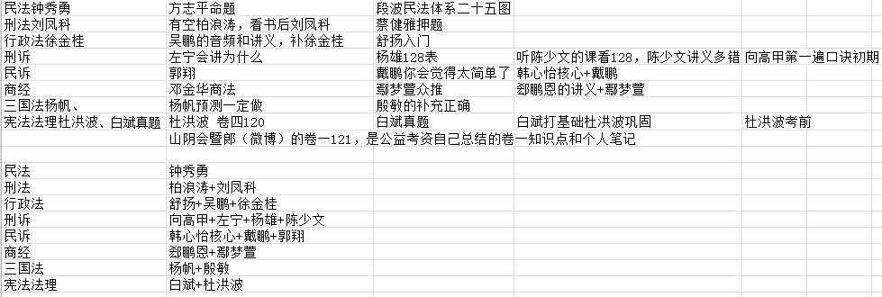 这个时候是3月中旬,我回顾了一下之前看过的经验贴,大家推荐的都是选老师而不选机构,所以我也开始选老师。我做了一个excel,里面记载了我所有看过的帖子里面的老师推荐,包括名字和特点,当时唯一的印象就是大家都推荐老钟和杜洪波卷四,excel附图片在下面,这是干货。上半部分是经验帖汇总,下半部分是我的计划,但是计划真的赶不上变化,这些老师最后我连一个都没听全。