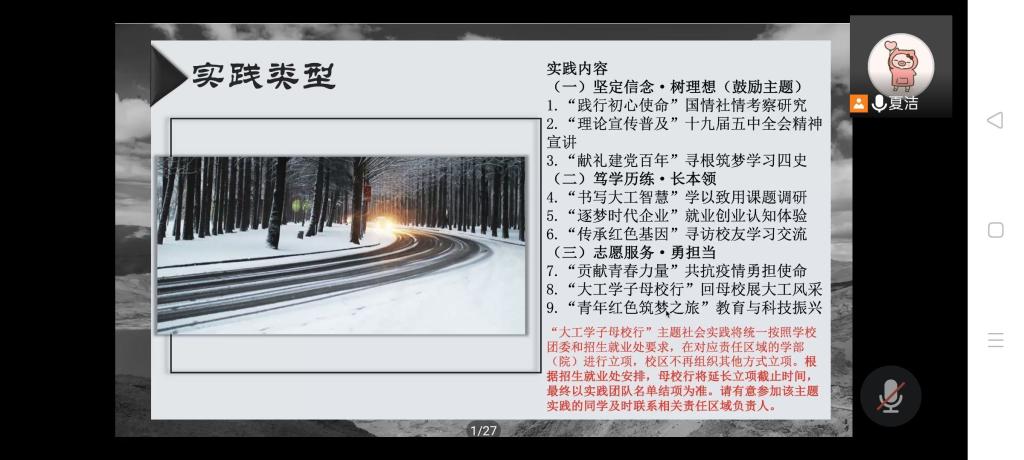 受疫情影响,本次寒假社会实践的内容和开展形式相较以往稍有不同。因此,针对此次实践,同学们的自主发挥空间很大。针对前期同学们提出的问题,商学院、知识产权学院团委社会实践部部长夏洁从前期立项及注意事项、实践过程、中期纪实内容要求、结项要求四方面进行了详细介绍。最后,由肖启老师进行动员及总结。肖启老师首先为同学们讲述了社会实践活动的意义,并重点针对“母校行”这一实践类别向参会同学分享经验,鼓励同学们积极参加本次寒假社会实践活动,并表示学院团委将全力提供支持与帮助。